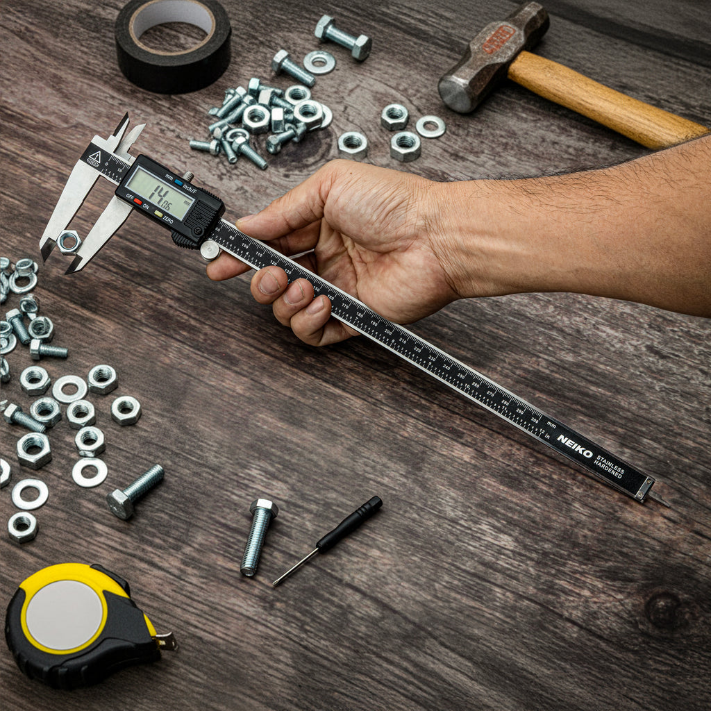 When it comes to precision and exact measuring in home improvement projects, the Neiko family of digital calipers are an excellent digital solution for your measuring needs due to its accurate and easy-to-read displays. Ranging from 6", 8", to 12" options, it is an essential tool to cover everything you need for your job at the worksite or automotive garage. Each tool comes with an extra-large LCD digital display for clear readouts and the stainless-steel build of these calipers ensures longevity and lasting service life over all your projects. Factory calibrated to professional standards, trust in Neiko for all your caliper-based application needs with an exact internal and outside measurement accurate to .001 of an inch with a display that can be zeroed at any point on the slide. The machine grooved thumb-roll mechanism and positioning lock are provided for sure adjustment. The premium steel shaft with depth-measurement probe, precision ground jaws, on-off switch with auto-off and inclusion of two long-life batteries (one spare) with each caliper makes each unit the choice measuring tool whether in standard SAE or metric MM or fractional display.