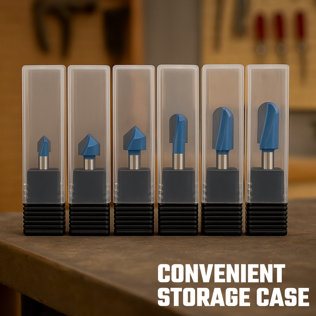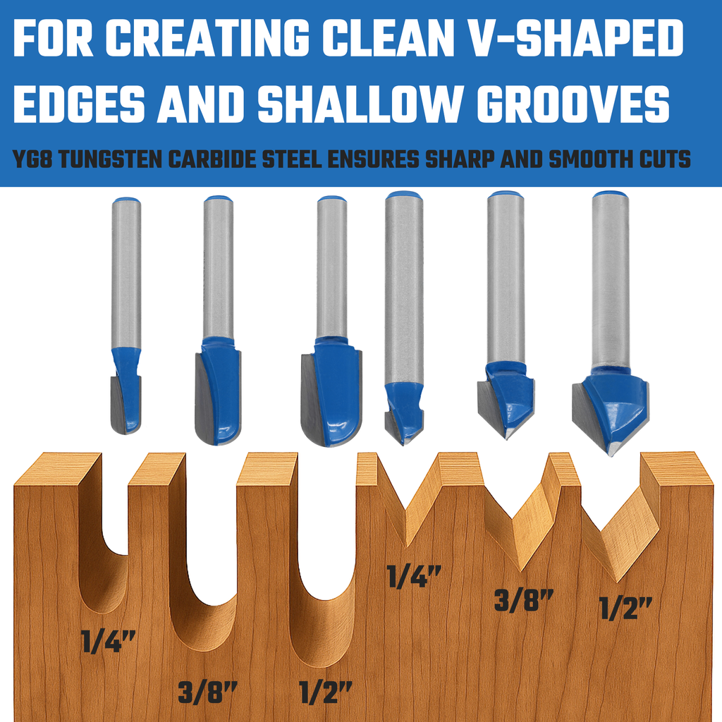 • 6 PIECE SET INCLUDES: 1/8” Radius V-Bit (1/4” Diameter x 1/4" Cutting Height), 3/16” Radius V-Groove Bit (3/8” Diameter x 13/32" Cutting Height), 1/14” Radius V-Grooving Bit (1/2” Diameter x 1/2” Cutting Height), then a 1/8" Radius Round nose bit (1/4” Diameter x 1/2” Cutting Height), 3/16” Radius Core Box Bit (3/8” Diameter x 25/32” Cutting Height), 1/4” Radius CoreBox Bit (1/2” Diameter x 13/16” Cutting Height).