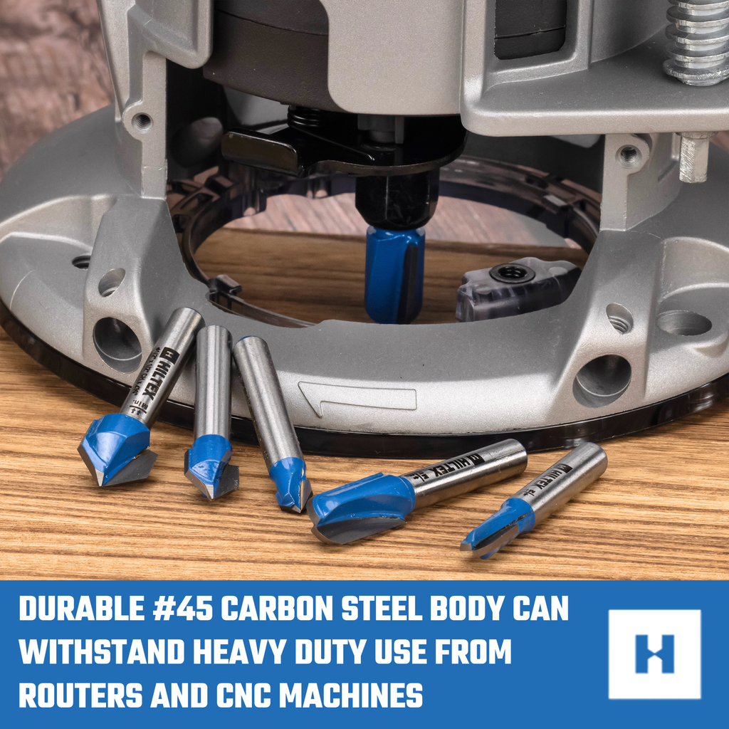• DURABLE YG8 TUNGSTEN CARBIDE BLADE, #45 CARBON STEEL BODY: Our v-groove and roundnose bits boast a YG8 Tungsten Carbide steel blade to help ensure a sharp, smooth, and clean burr-free wood cut all while balanced on a carefully crafted solid, durable, powder coated, hardened #45 Carbon Steel body so these bits can withstand heavy duty use from high-powered routers and CNC machines at RPM ≤ 16000 over a long period of time.