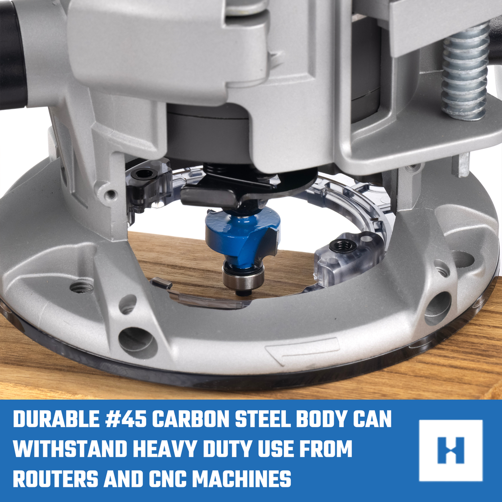 - DURABLE YG8 TUNGSTEN CARBIDE BLADE, #45 CARBON STEEL BODY: Our round over bits boast a YG8 Tungsten Carbide steel blade to help ensure a sharp, smooth, and clean burr-free wood cut all while balanced on a carefully crafted solid, durable, powder coated, hardened #45 Carbon Steel body so these bits can withstand heavy duty use from high-powered routers and CNC machines at RPM ≤ 16000 over a long period of time.