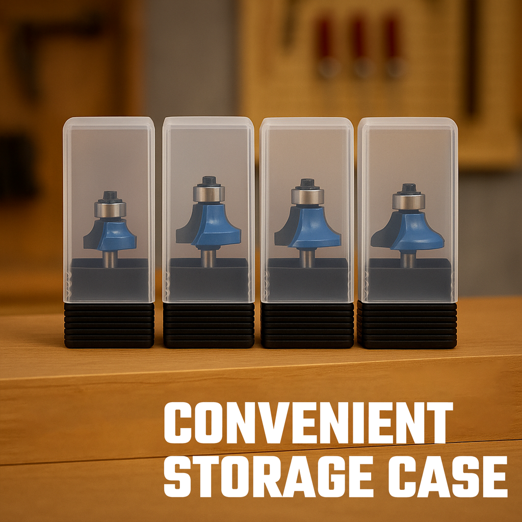 - CONVENIENT STORAGE CASES: Each quarter round bit comes in its own clearly labeled miniature plastic case and mount, allowing you to easily carry around or safely store these bullnose corner round-over router bits in any tool chest when not using them.