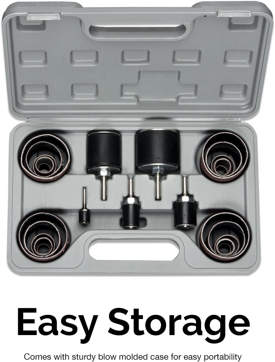 - WHAT’S INCLUDED: This sanding kit includes 5 rubber drums (1/2", 3/4", 1", 1 1/2", and 2"), 2 sets of coarse 80-grit sandpaper, and 2 sets of fine 120-grit sandpaper. It comes with a sturdy blow-mold storage case.