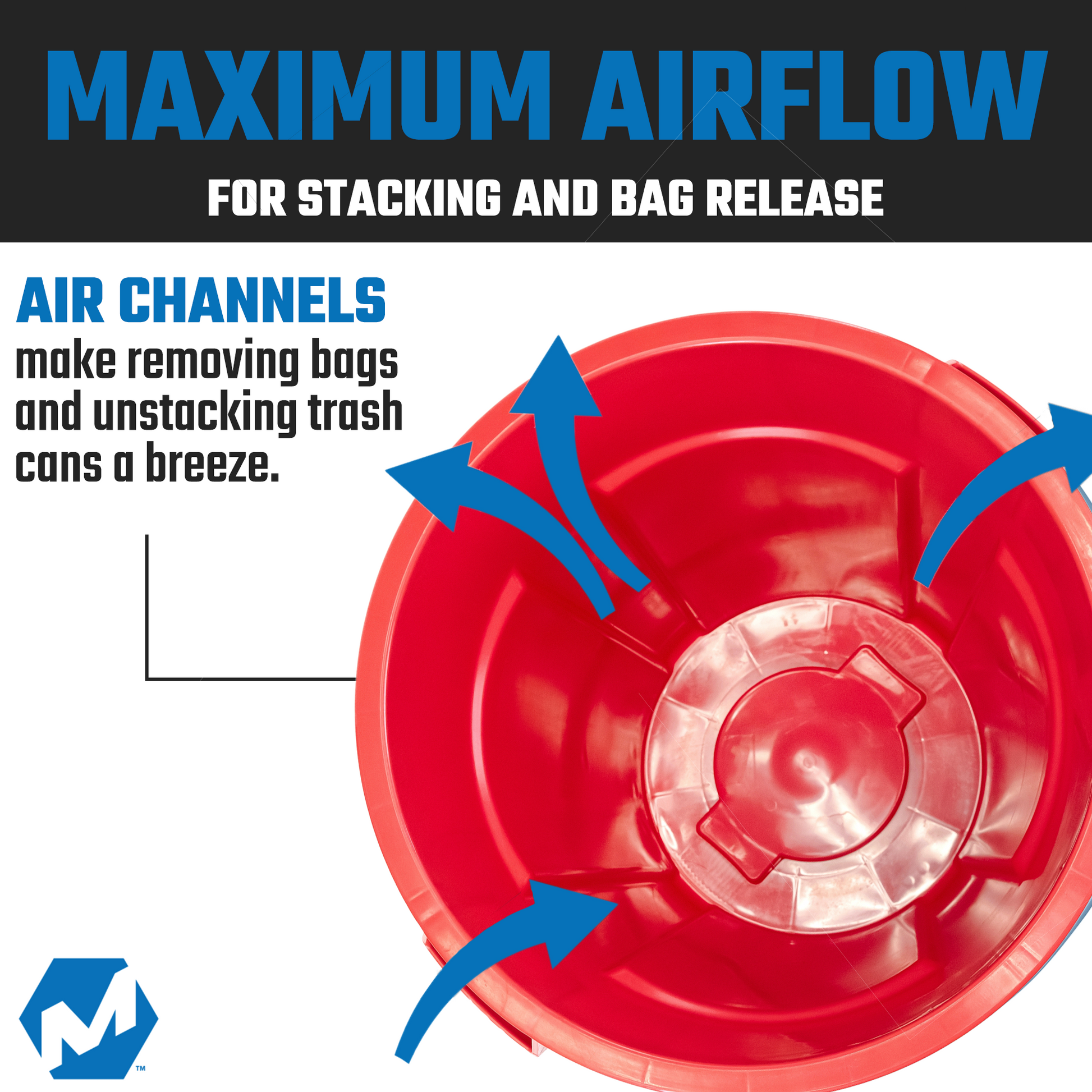 - VENTED CHANNELS: The MAGNUM trash can is constructed with air vents along the sides to allow for garbage bags and liners to easily slide in and out without building air pressure and getting stuck. This design also allows our cans to easily disengage from one another when stacked for transport or storage.
