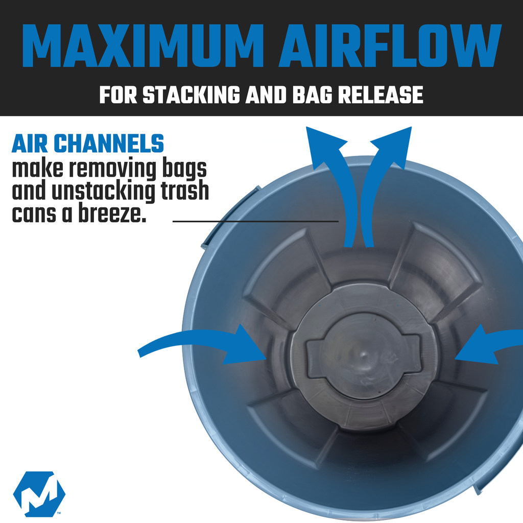 - VENTED CHANNELS: The MAGNUM trash can is constructed with air vents along the sides to allow for garbage bags and liners to easily slide in and out without building air pressure and getting stuck. This design also allows our cans to easily disengage from one another when stacked for transport or storage.