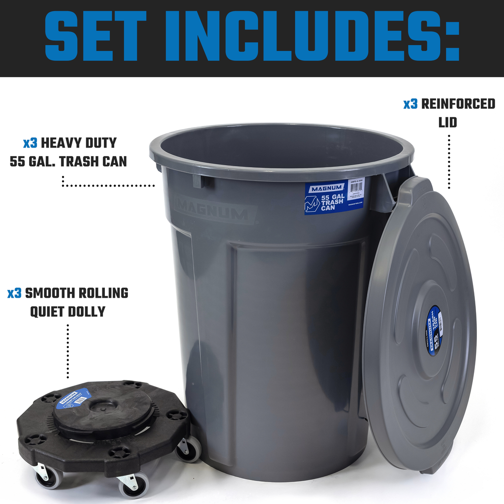 MAGNUM Gray 55 Gallon Trash Can Set (Trash Can, Quiet Dolly, and Reinforced Lid), Construction Grade, Jobsite Ready, Non-Marking Wheels & Casters for Rolling Garbage CMTC-CLD0-55G03 (3 Set)