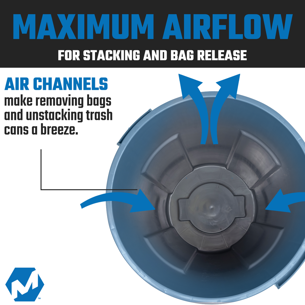 • VENTED CHANNELS: The MAGNUM trash can is constructed with air vents along the sides to allow for garbage bags and liners to easily slide in and out without building air pressure and getting stuck. This design also allows our cans to easily disengage from one another when stacked for transport or storage.