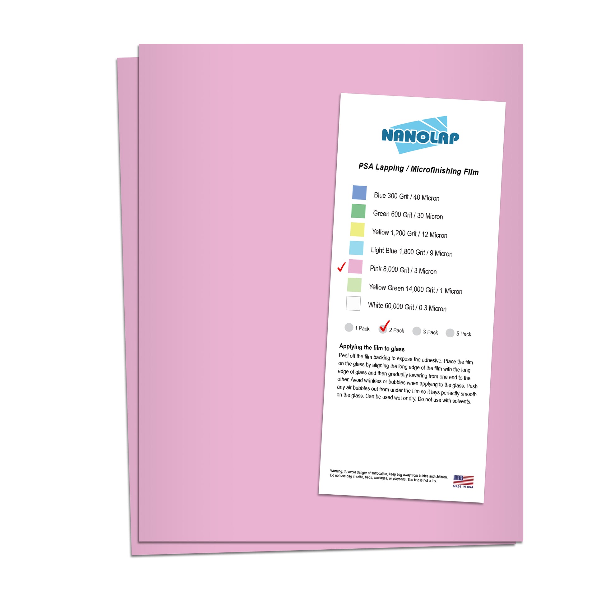 To cater to all your sharpening and polishing needs, Nanolap manufacturers lapping film in a variety of grit sizes and sheet sizes. Available in a comprehensive, color-coded assortment of 10 different micron sizes: 60 micron (260 Grit/white), 40 micron (300 grit/blue), 30 micron (600 grit/green), 15 micron (1000 grit/white) 12 micron (1,200 grit/yellow), 9 micron (1,800 grit/light blue), 5 micron (4000 grit/brown), 3 micron (8,000 grit/pink), 1 micron (14,000 grit/yellow green), and 0.3 micron (60,000 grit/white). Elevate your sharpening and polishing game with our premium precision sanding film and enjoy professional-grade results with every use.