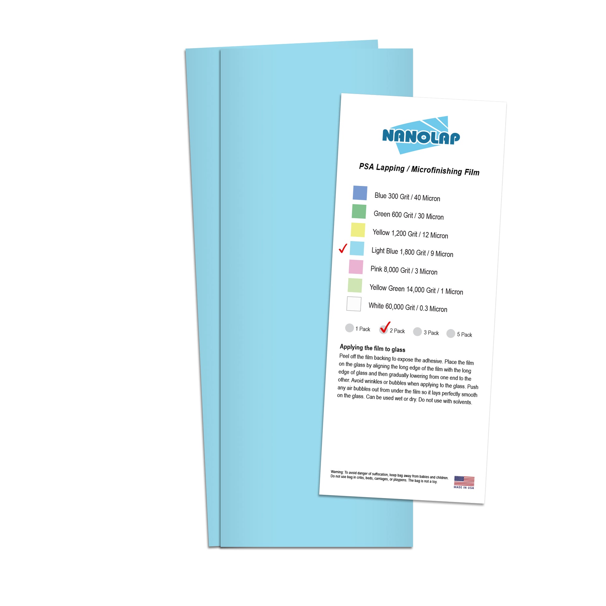 To cater to all your sharpening and polishing needs, Nanolap manufacturers lapping film in a variety of grit sizes and sheet sizes. Available in a comprehensive, color-coded assortment of 10 different micron sizes: 60 micron (260 Grit/white), 40 micron (300 grit/blue), 30 micron (600 grit/green), 15 micron (1000 grit/white) 12 micron (1,200 grit/yellow), 9 micron (1,800 grit/light blue), 5 micron (4000 grit/brown), 3 micron (8,000 grit/pink), 1 micron (14,000 grit/yellow green), and 0.3 micron (60,000 grit/white). Elevate your sharpening and polishing game with our premium precision sanding film and enjoy professional-grade results with every use.