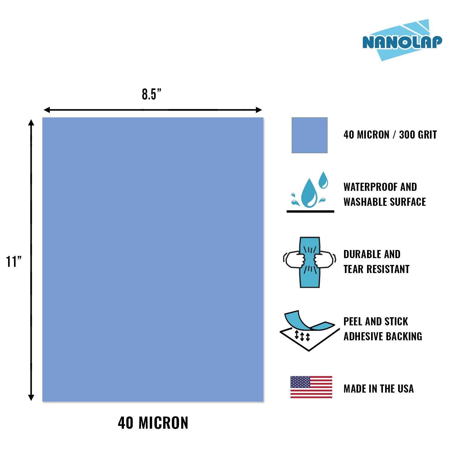 - 40.0 MICRON SIZE: The ultrafine 40.0 micron (300 grit/blue) lapping film sheet provides one of the beginning stage steps for producing ridiculously sharp blades with an impressive mirror-like finish.