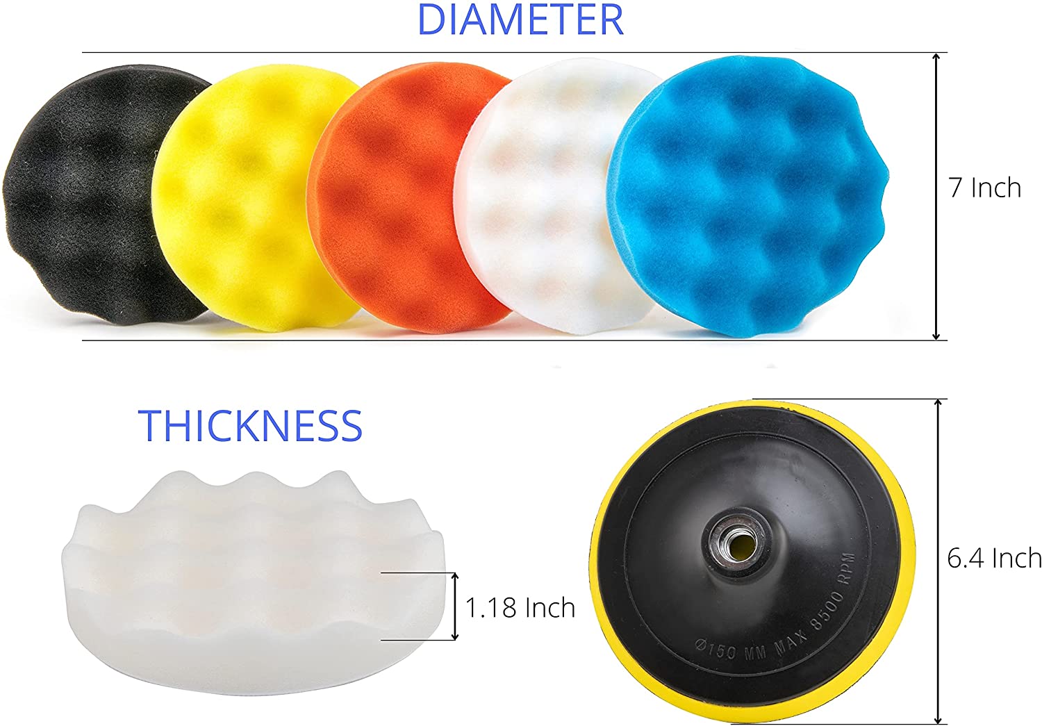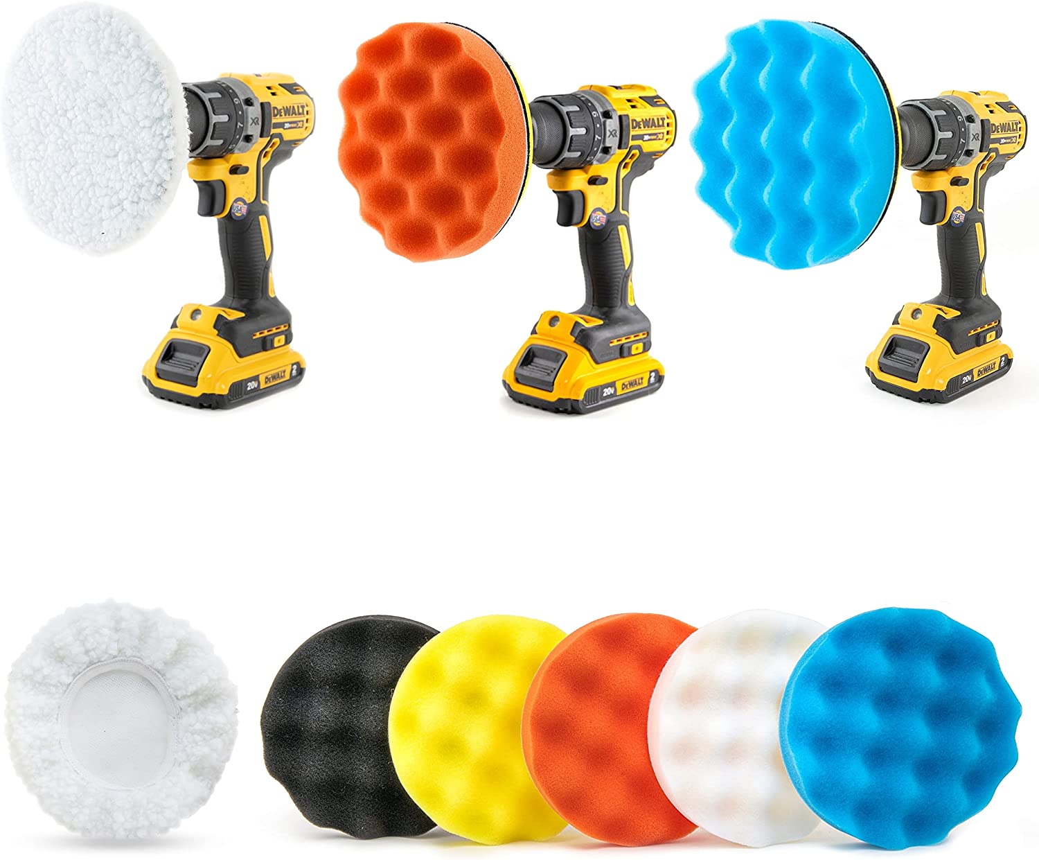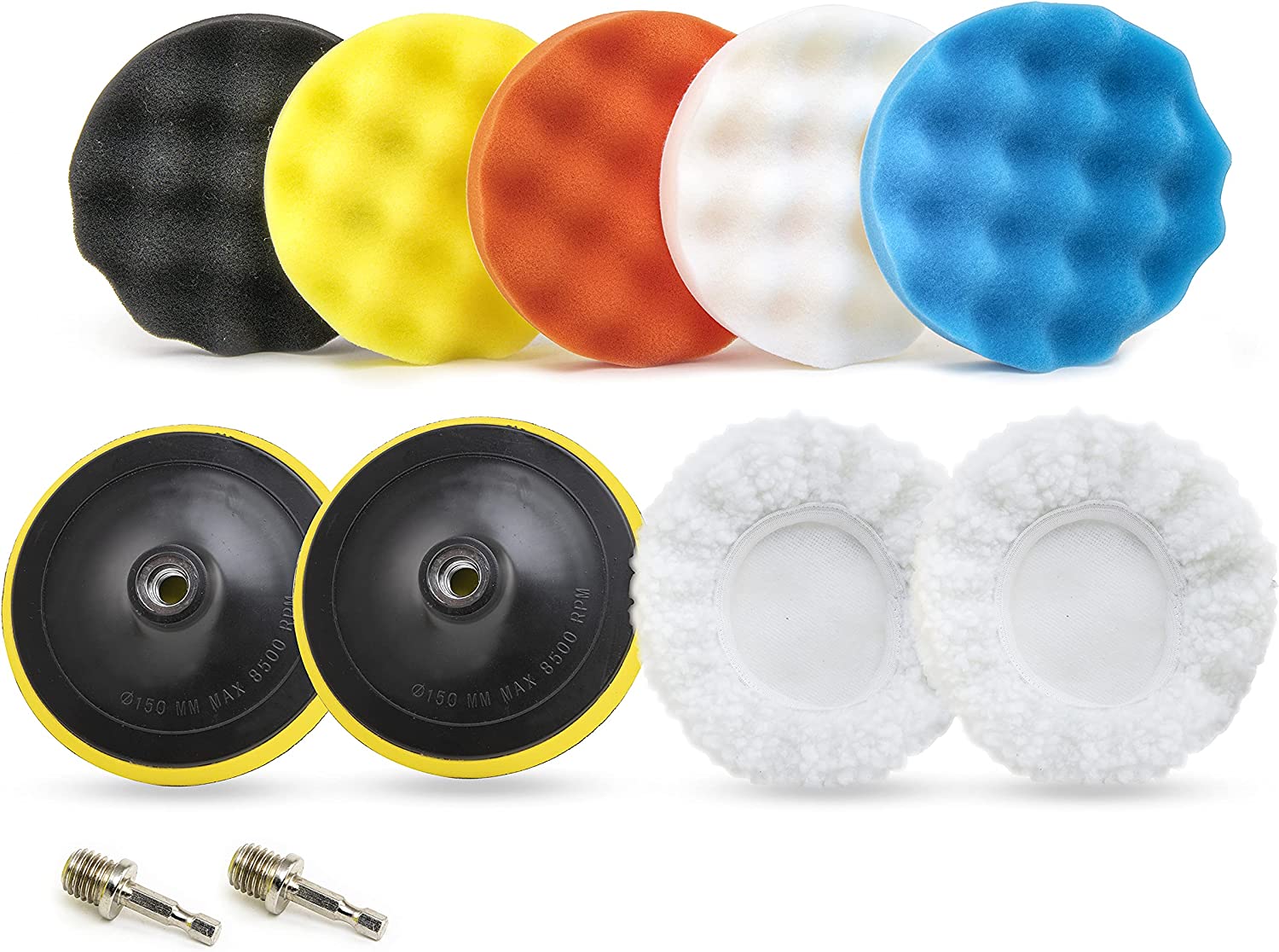 - 11 PIECE INCLUDES: 5pcs 6 inch buffing pad kit for drill includes foam buffing pads (orange / white- coarse; yellow- medium; black / blue- fine) - 2pcs white buffer bonnets (final cleaning), 2pcs hook and loop backing-up pads and 2pcs ¼” adapters.