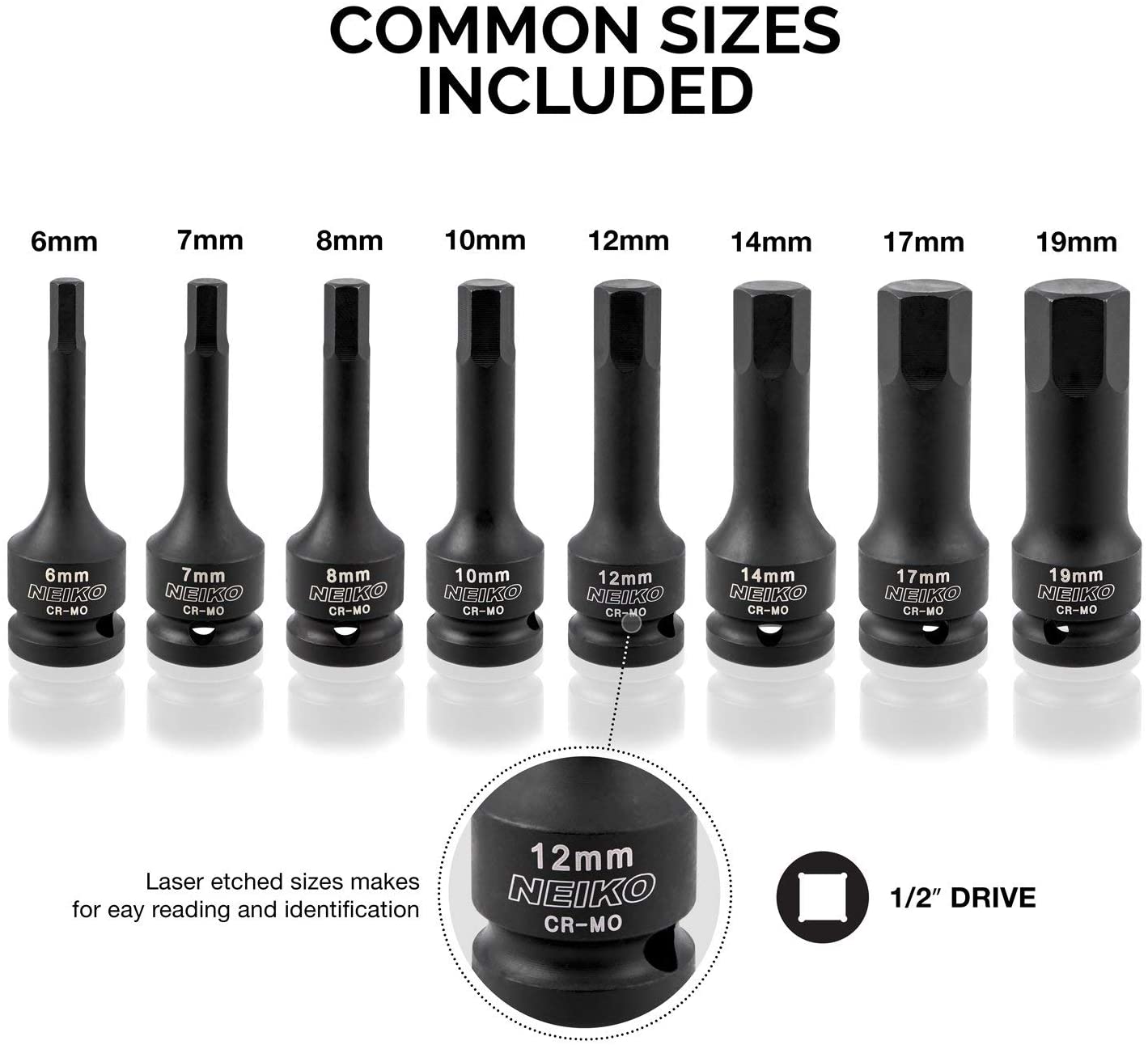 - COMMON SIZES: Includes metric sockets 6, 7, 8, 10, 12, 14, 17, and 19 mm
