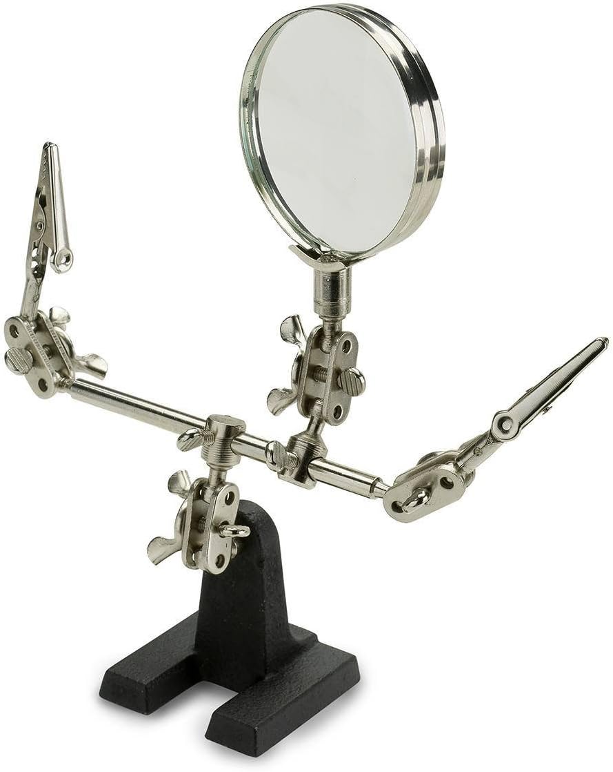 Helping hand tool with magnifier. Heavy duty cast iron base. 2-1/2-Inch, 2X magnifying glass for precision work without eyestrain. Dual alligator spring clamps hold work piece steady.