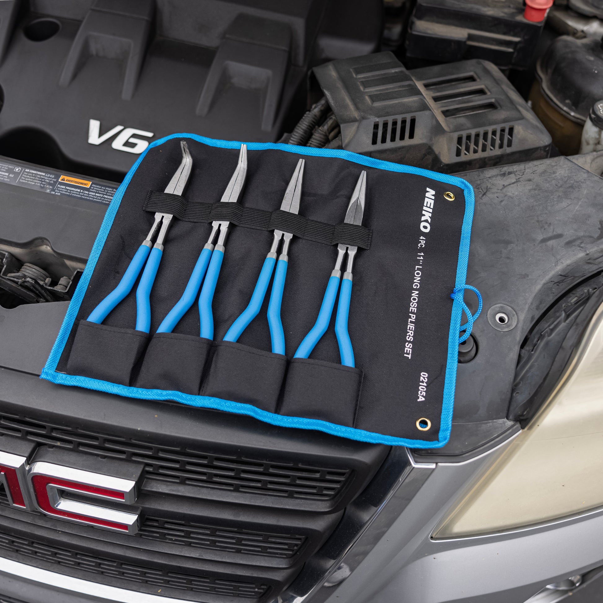 Standard needle-nose pliers run out of reach fast. This 4-piece set gives you 11 inches of long-nose access in four configurations — straight, 45-degree, 90-degree, and S-curve — so you can reach wires, clips, and components at any angle in any cavity.