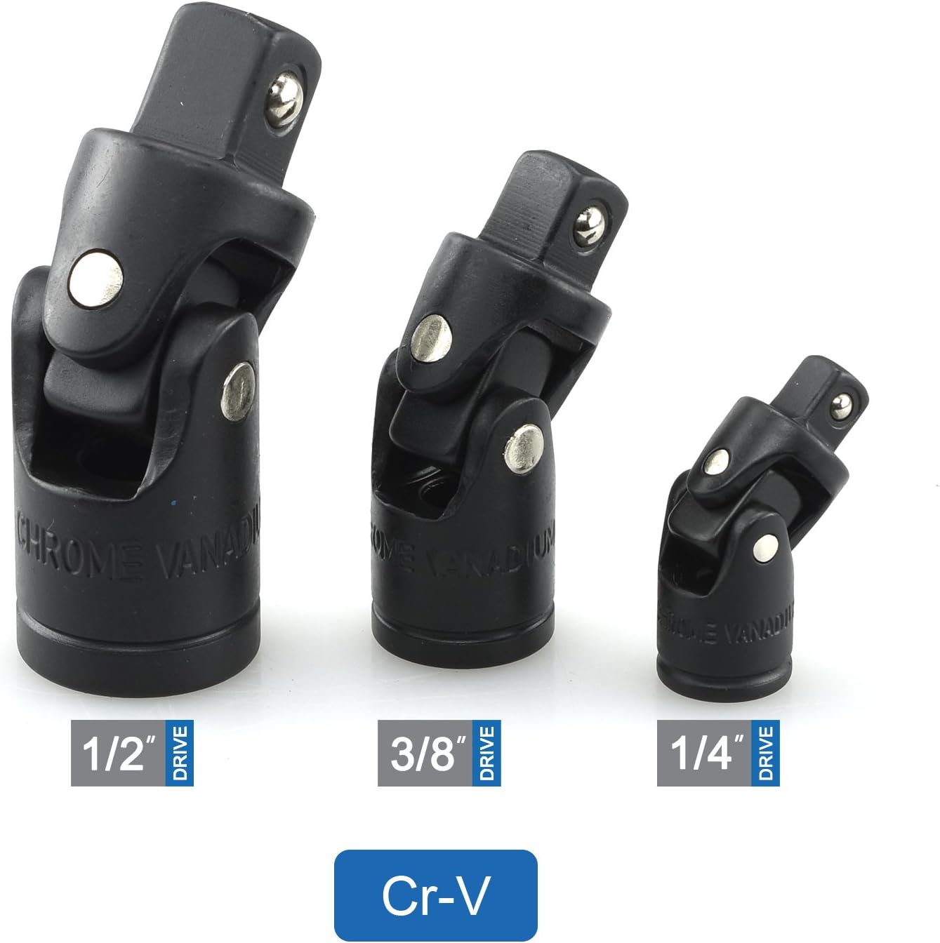 When a fastener isn't in a straight line from your tool, you need a universal joint. This 3-piece set covers all three standard drive sizes with impact-rated CrV steel construction and dual-direction swivel that transfers torque around obstructions.