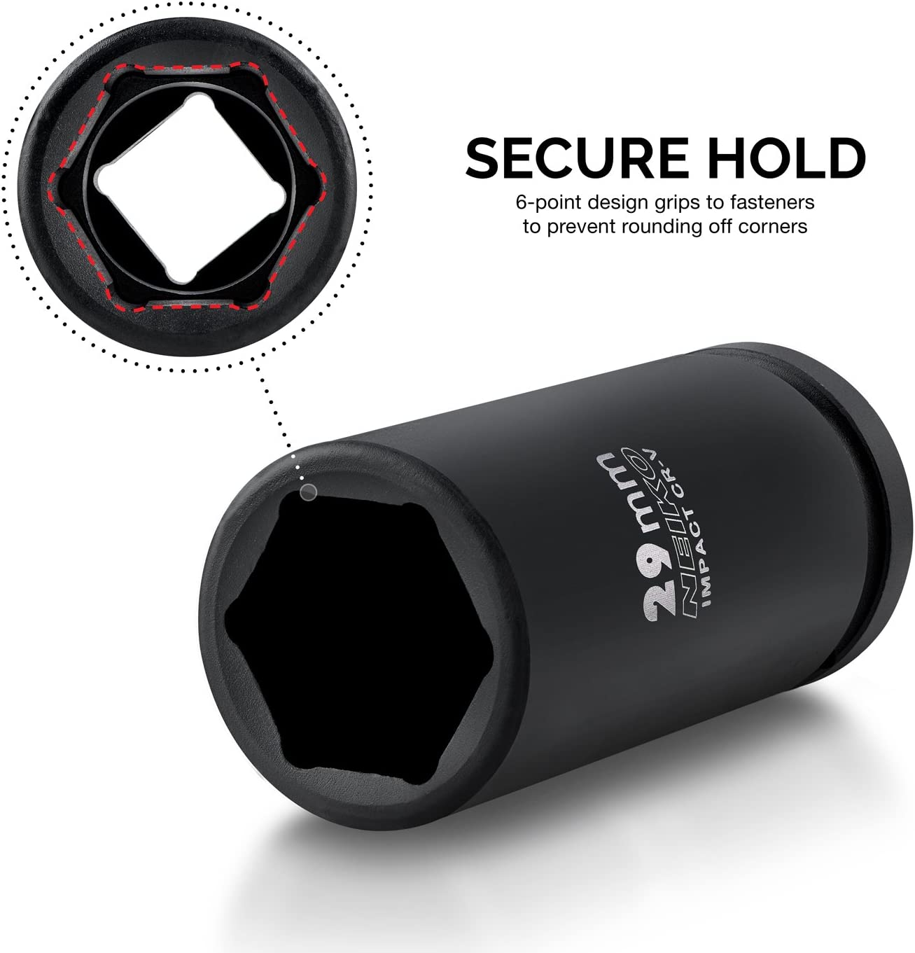 - SPECIAL DEEP DESIGN: Each socket has a unique design that grips the flat sides of fasteners rather than the corners to prevent stripping and rounding off of bolts. With a high torque impact gun, each Metric socket will torque the most stubborn fasteners.