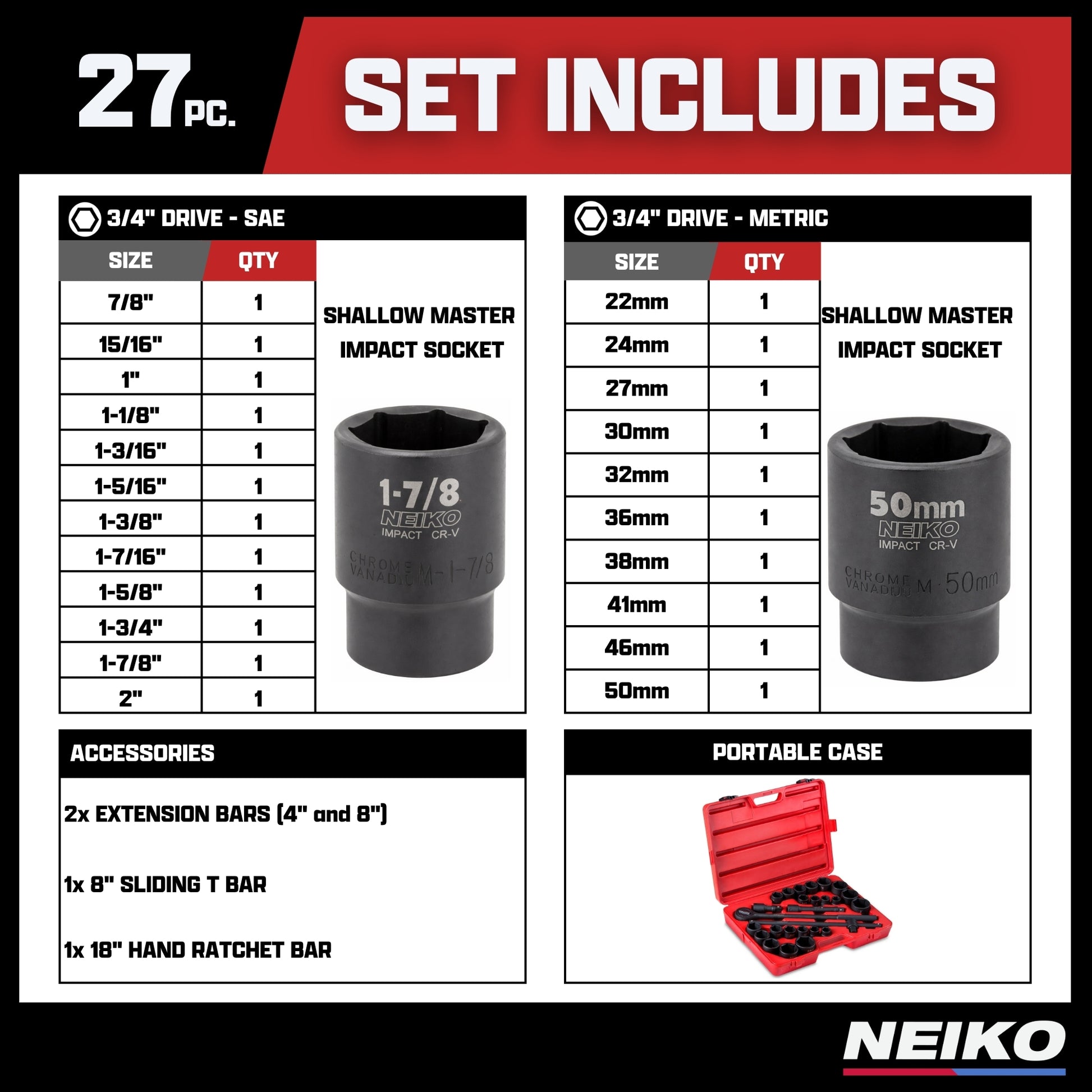 - 12× SAE Sockets: 7/8", 15/16", 1", 1-1/8", 1-3/16", 1-5/16", 1-3/8", 1-7/16", 1-5/8", 1-3/4", 1-7/8", 2"