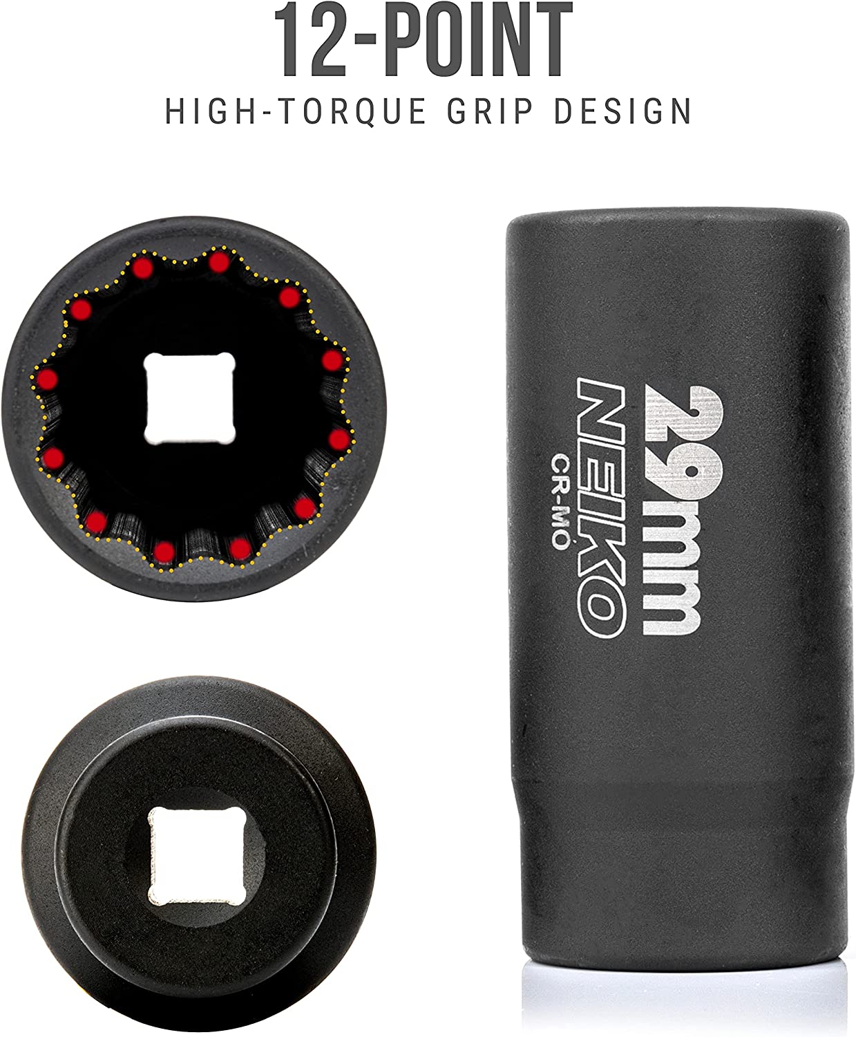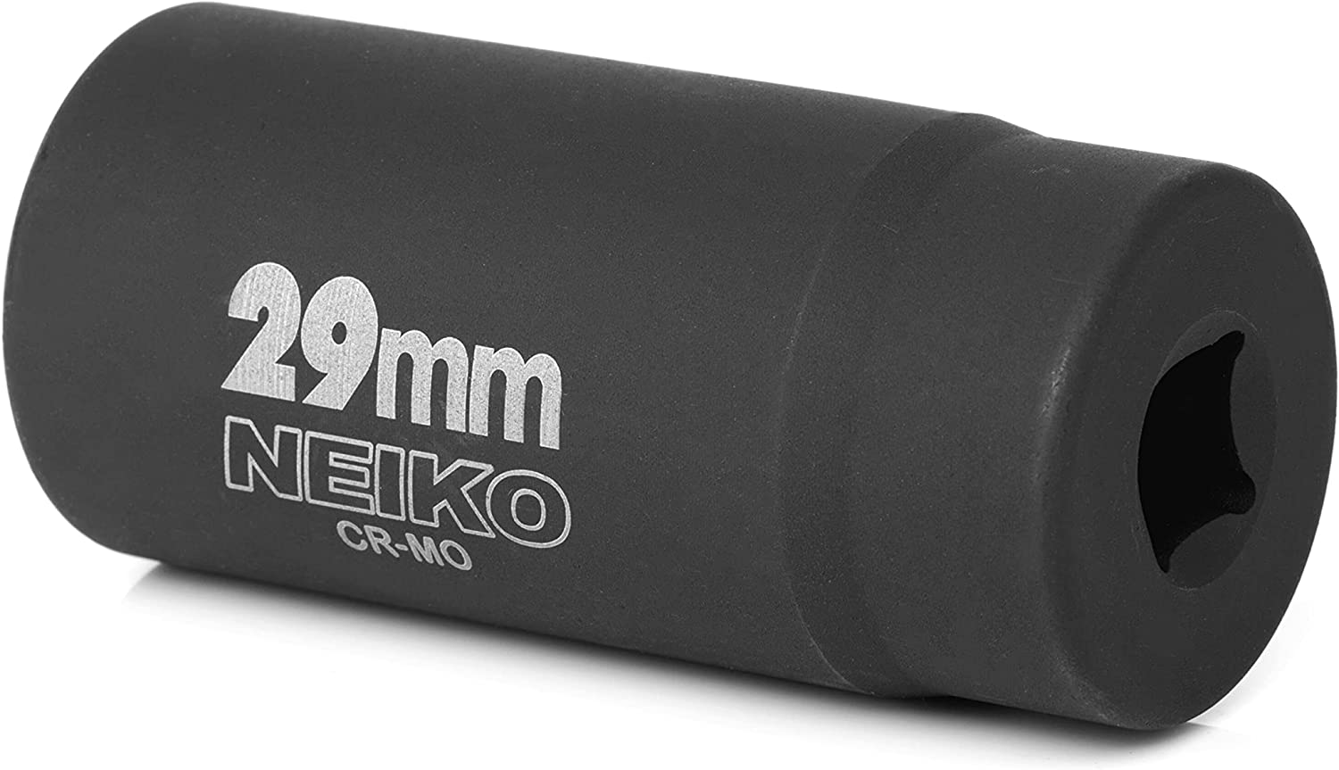 This 29 MM Neiko Axle Nut is constructed of chrome moly which is capable of high impact applications to get those sturdy bolts. Removing axles, steering knuckles, and steering hub assemblies. Garage warriors and mechanics can now work on those automotive projects at home. Car and truck wheel bearings can now be replaced in your garage. Works on most well known auto brands. Remove front wheel drive cv axles is a breeze with this socket set. Deep enough to reach through with a breaker bar or a impact gun. Rounded 12 point openings to grip sides of fasteners, not corners, preventing round off. High visibility size markings etched into the side wall to read easy even in low light areas.