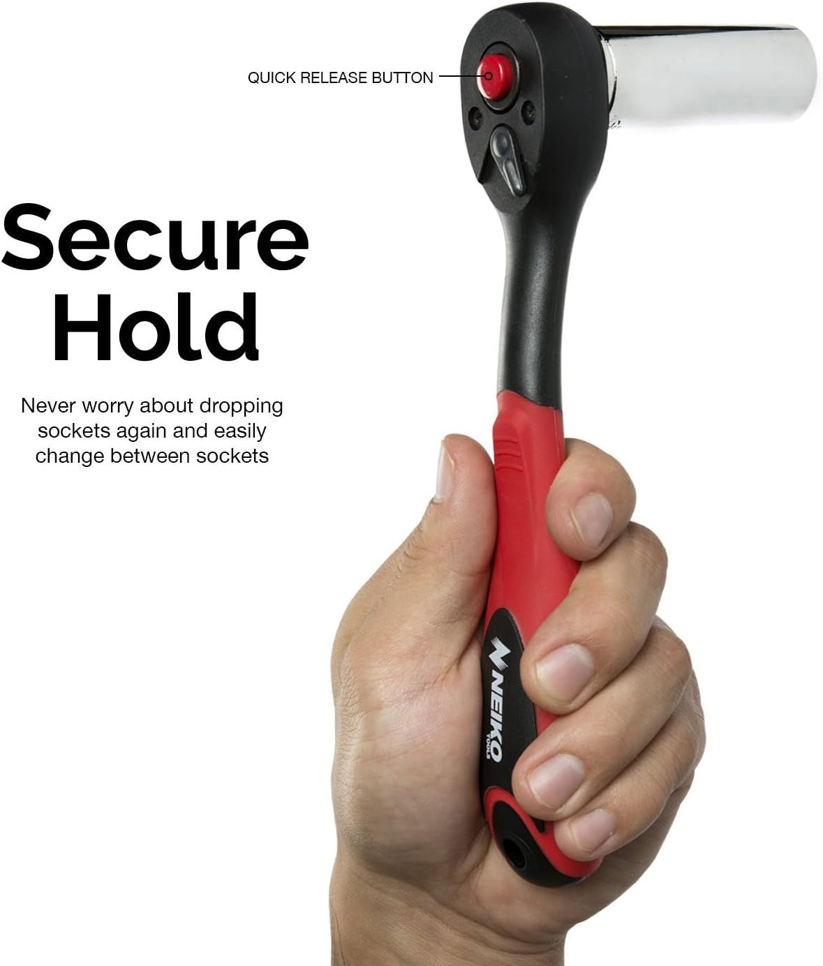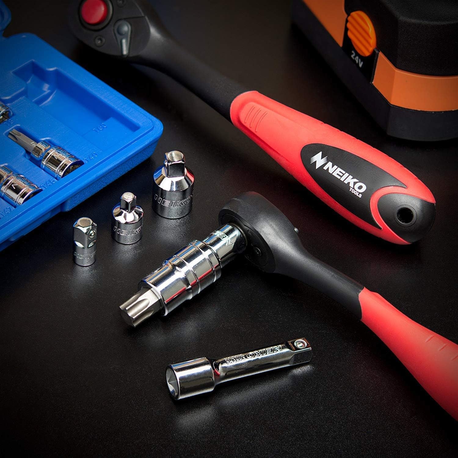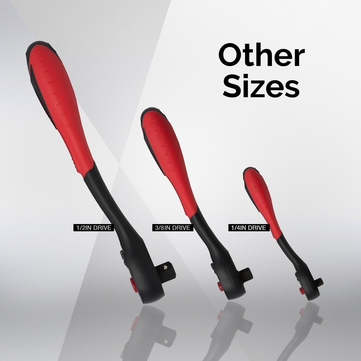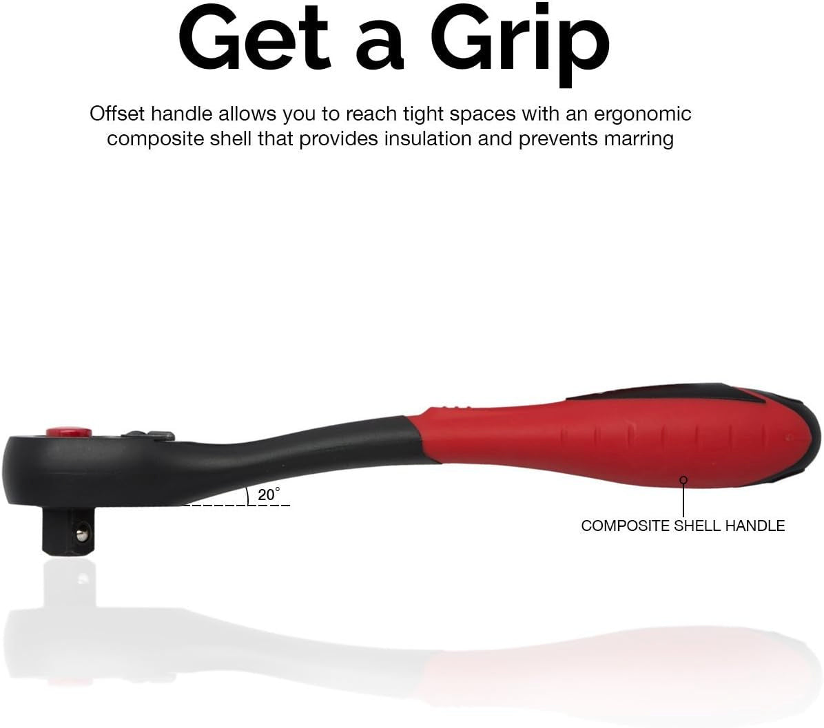 Under six inches long with a 5° swing arc — this is the ratchet that fits where nothing else will. The offset handle creates working clearance and prevents scraped knuckles, while the composite shell protects both the tool and the surfaces around it from scratches.