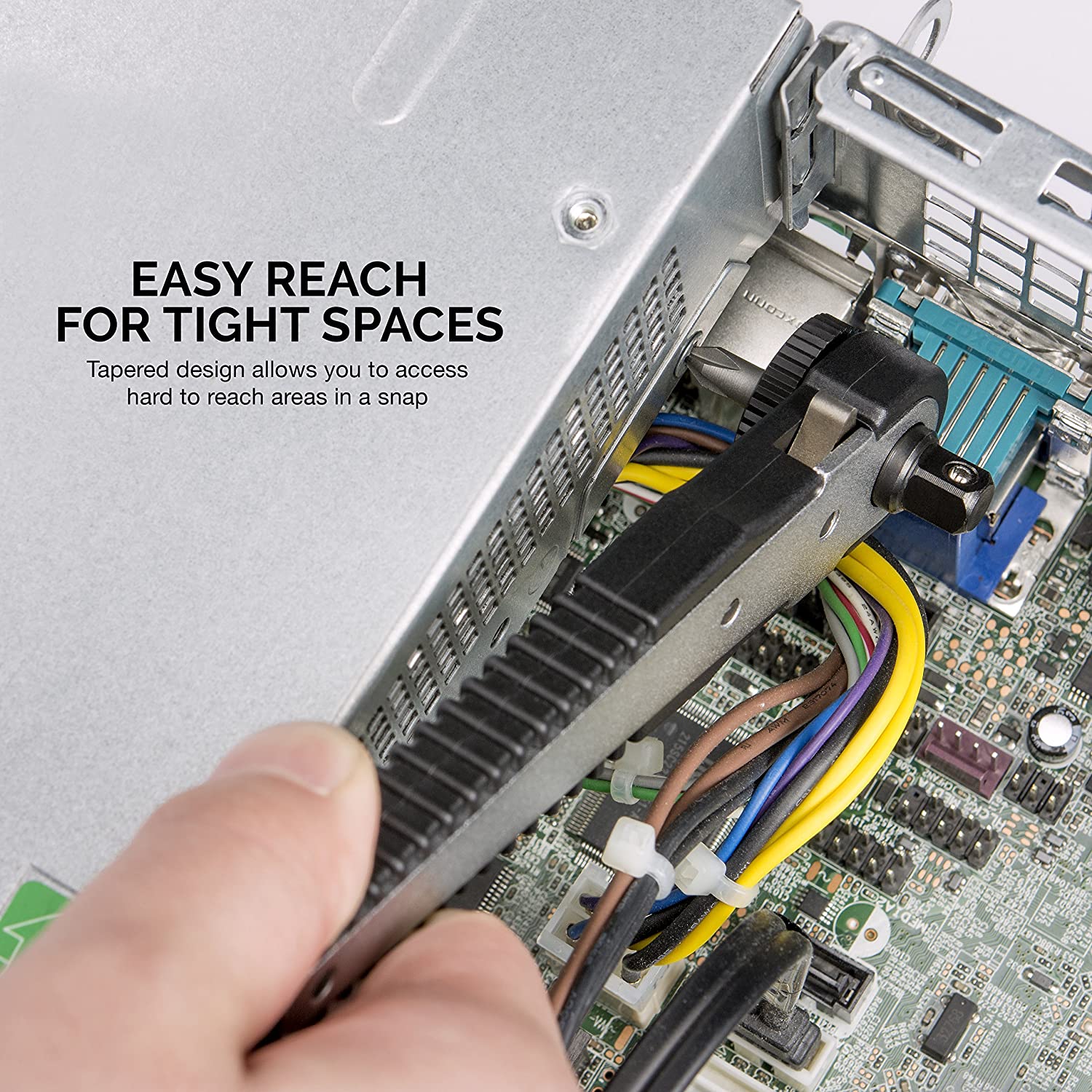 90° Offset, 5.5" Handle Gets into spaces where straight ratchets and screwdrivers can't fit. 12-tooth reversible ratcheting mechanism.