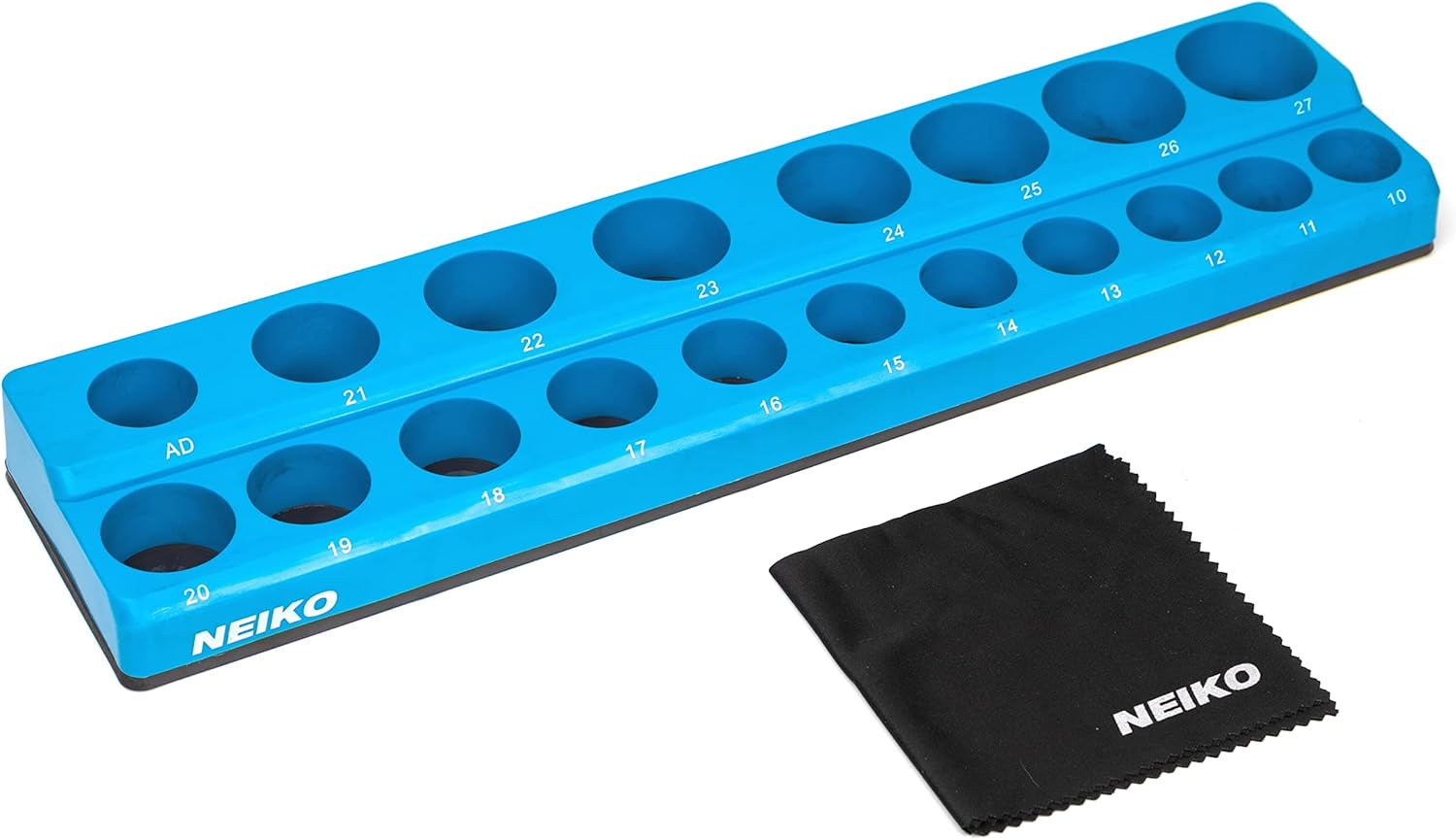 Holds 19 of your 1/2" drive metric sockets from 10 mm to 27 mm — deep or shallow. Strong ferrite magnet, rubberized scratch-free base, high-visibility size markings. Includes cleaning cloth.