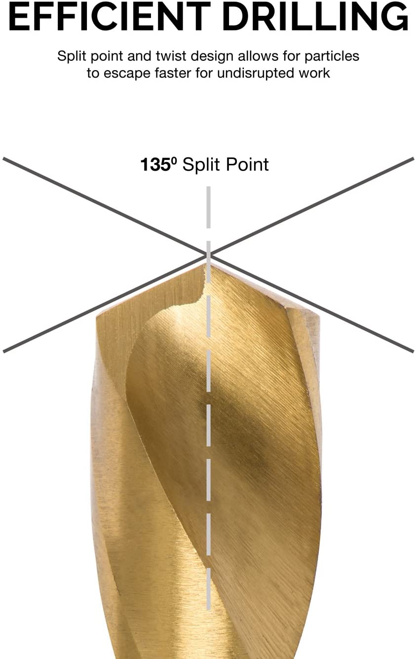 135° Split Point Self-centering geometry prevents walking and increases cutting speed. Twist-style flutes clear chips efficiently.