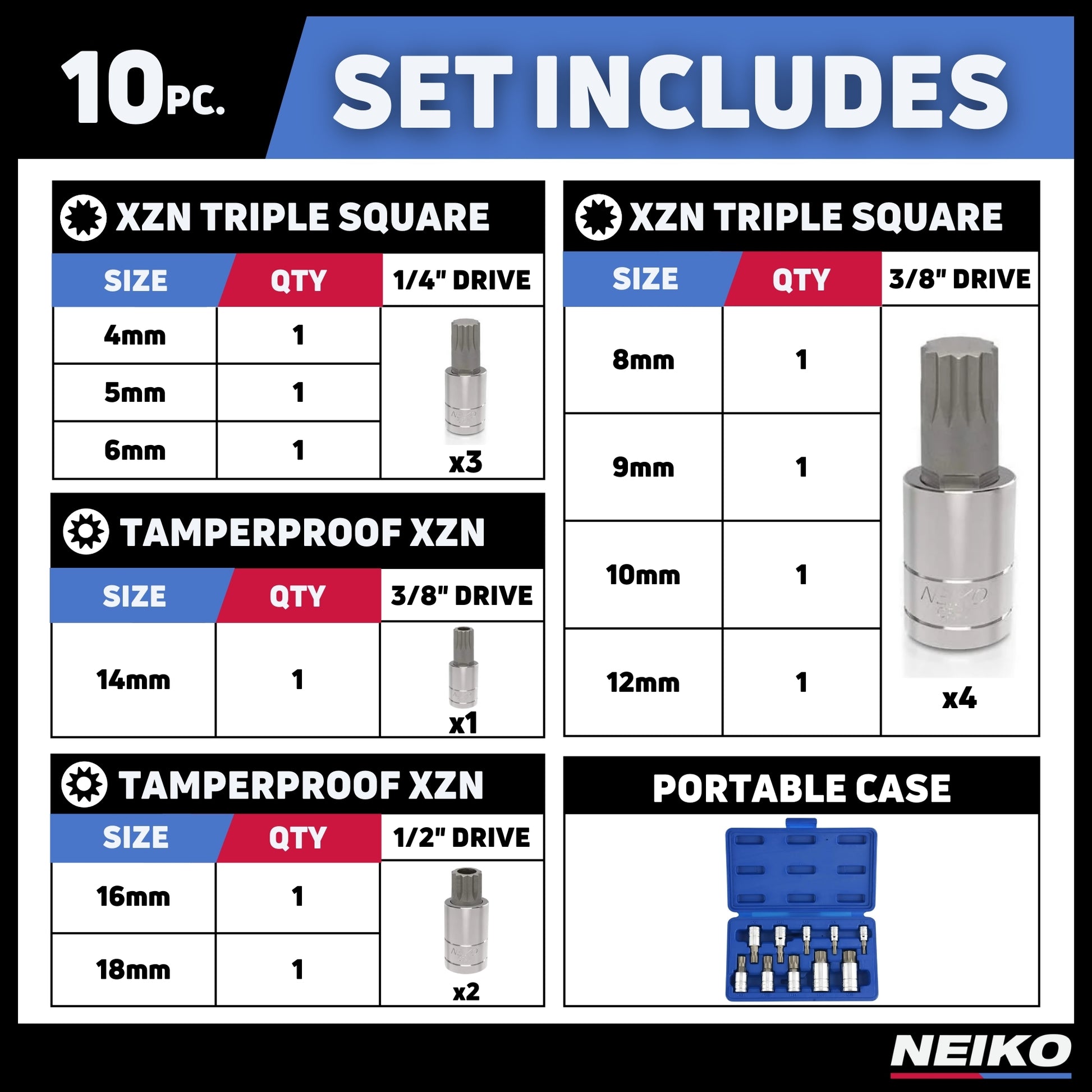 Sizes: 1/4" drive (4, 5, 6 mm), 3/8" drive (8, 9, 10, 12, TP 14 mm), 1/2" drive (TP 16, TP 18 mm). Case included.