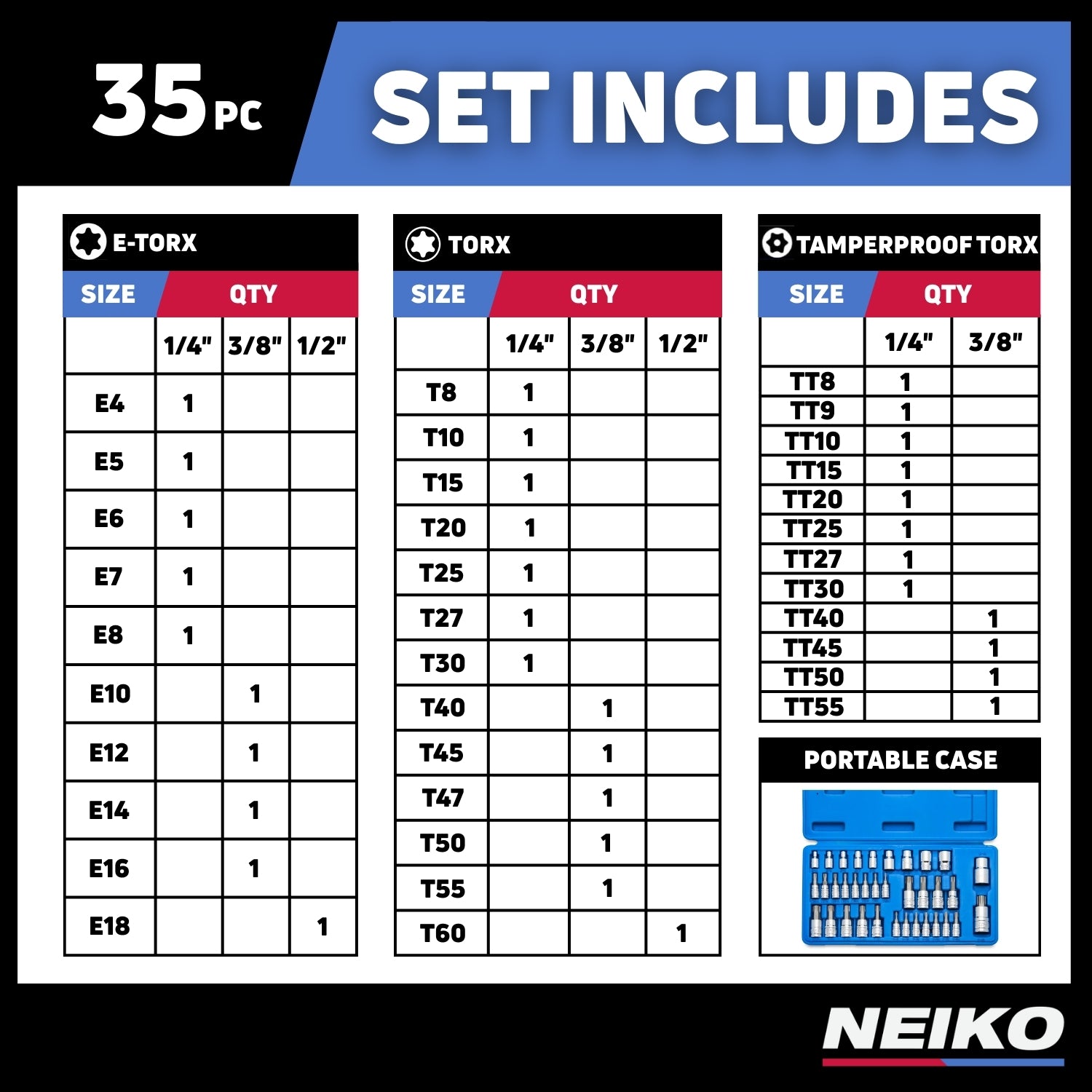 Neiko 10070A Torx Bit Socket and E-Torx Star Socket Set | 35-Piece Set, S2 and Cr-V Steel, 1/4”, 3/8” and 1/2-Inch Drive