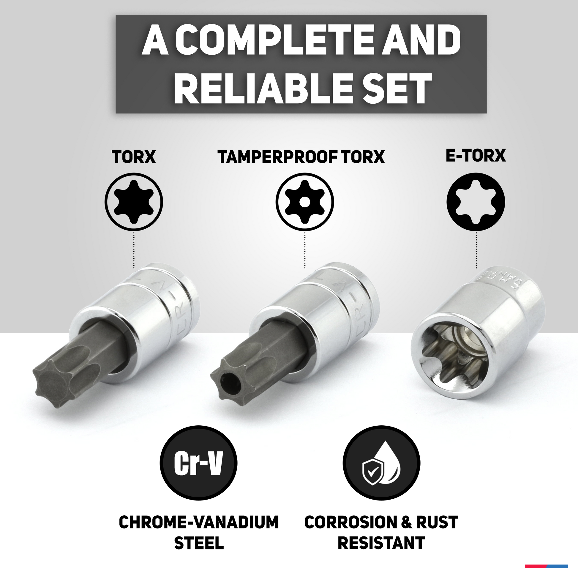- PREMIUM QUALITY: 35-piece set of ultra-strong, tamper-resistant external steel Torx E female socket and Torx bit socket