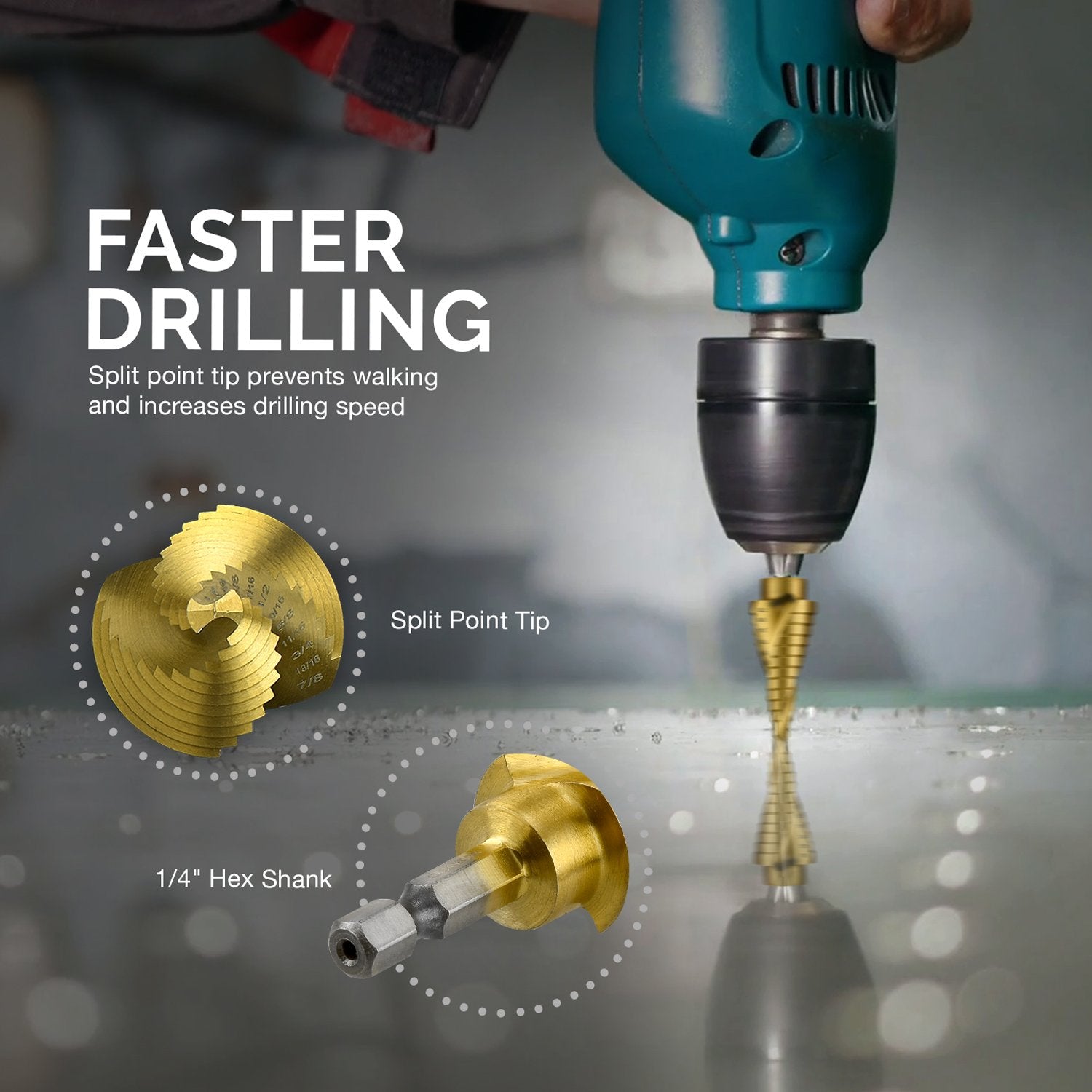 - STEP DRILL BIT FOR METAL: With a split point tip that accelerates cutting speed while preventing angled walking away from center line of bore, drilling holes in metal is fast, efficient, and clean.
