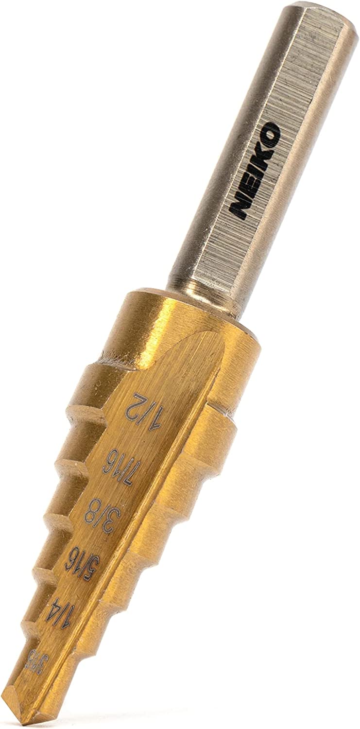 This step drill bit for metal can drill holes in the following sizes: 3/16", 1/4", 5/16", 3/8", 7/16", and 1/2". You can use our high-speed drill bit for steel jobs at home or work, and its small size allows you to pack it in your toolbox and take it wherever you go. Whether you need a multifunctional drill bit to cut through stainless steel or a new step bit to add to your equipment, NEIKO has your back with our durable, dependable, and strong tools.