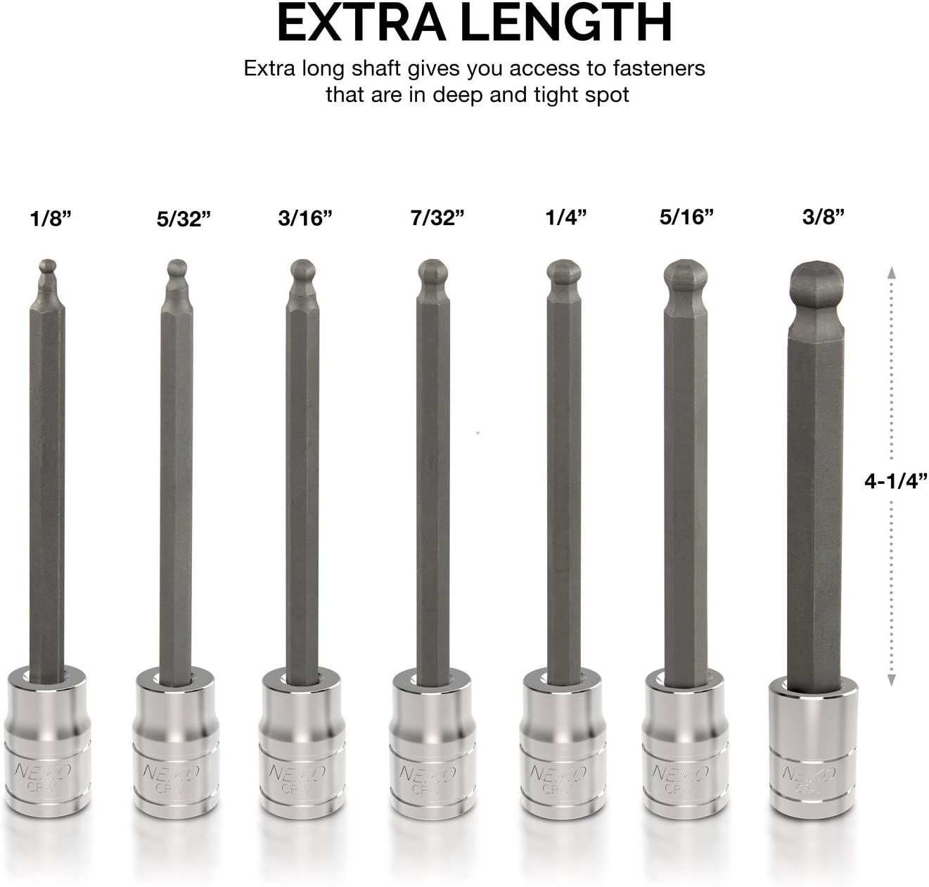 The NEIKO 3/8-Inch-Drive Extra-Long Ball-End Hex-Bit Socket Set gives you extra power and precision when you need to apply or remove screws, bolts, and other fasteners. Each bit is made from durable premium S2 alloy steel and features a silver chrome finish for added longevity and protection against rust and corrosion. These powerful hex sockets will withstand extreme torque to handle even the toughest fasteners.