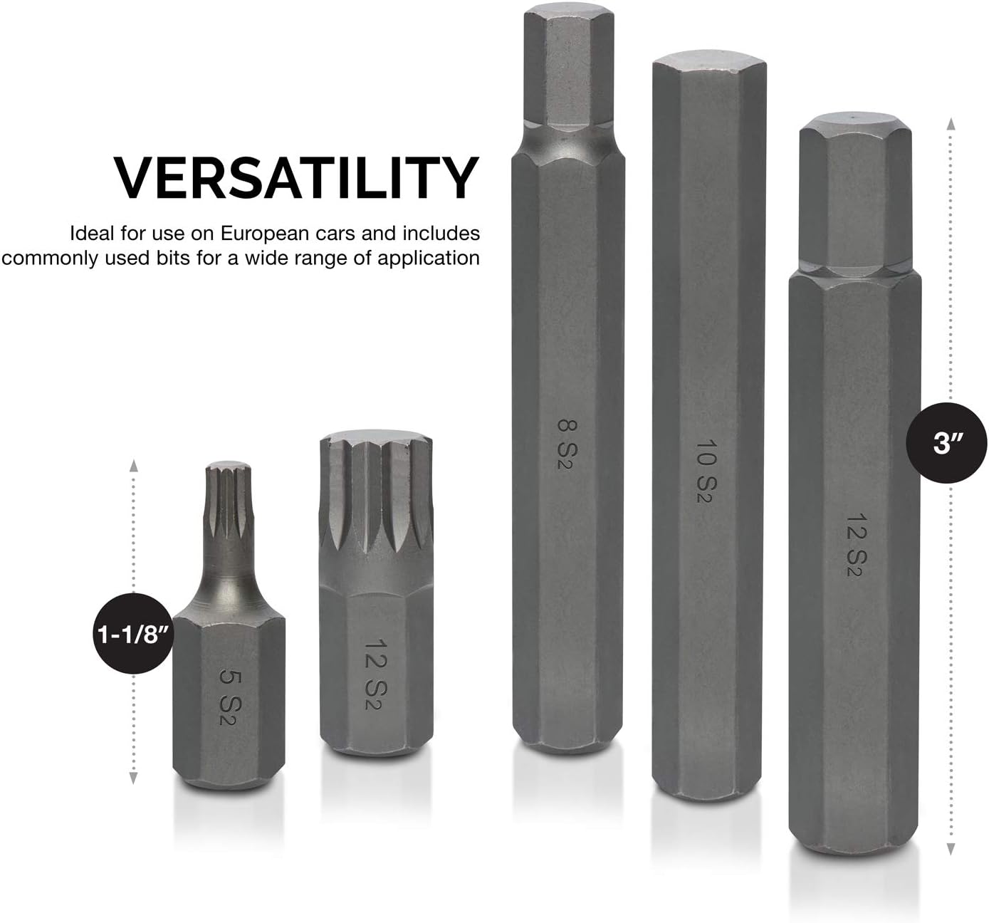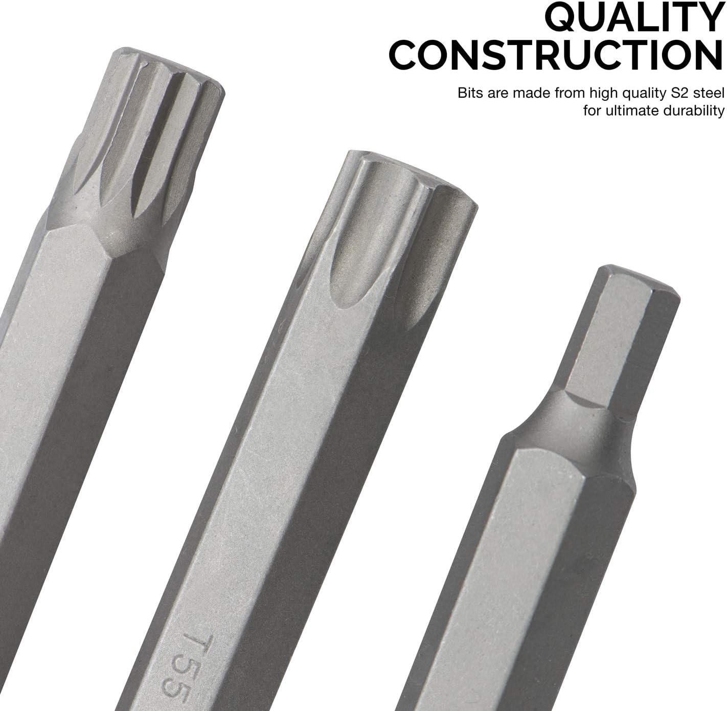 - [SIZES]: 19 Long Bit: Includes: 4, 5, 6, 7, 8, 10, 12 mm (hex), T20, T25, T30, T40, T45, T50, T55 (Torx) and M5, M6, M8, M10, M12 (XZN Spline)