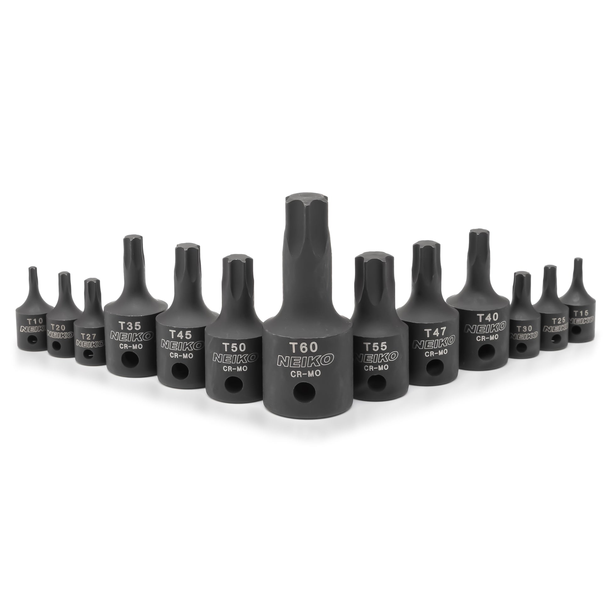 Neiko 10281B Impact Torx Socket Set, Cr-Mo, 13-Piece, heavy duty impact socket designed for pneumatic air tools, power tools or hand tools. These Torx bits can handle the higher torque and vibration generated by an impact power wrench when loosening and tightening fasteners making it a perfect addition to any toolbox. Sizes are marked with a high-visibility laser marking for easy identification, comes with a hard plastic blow molded case.