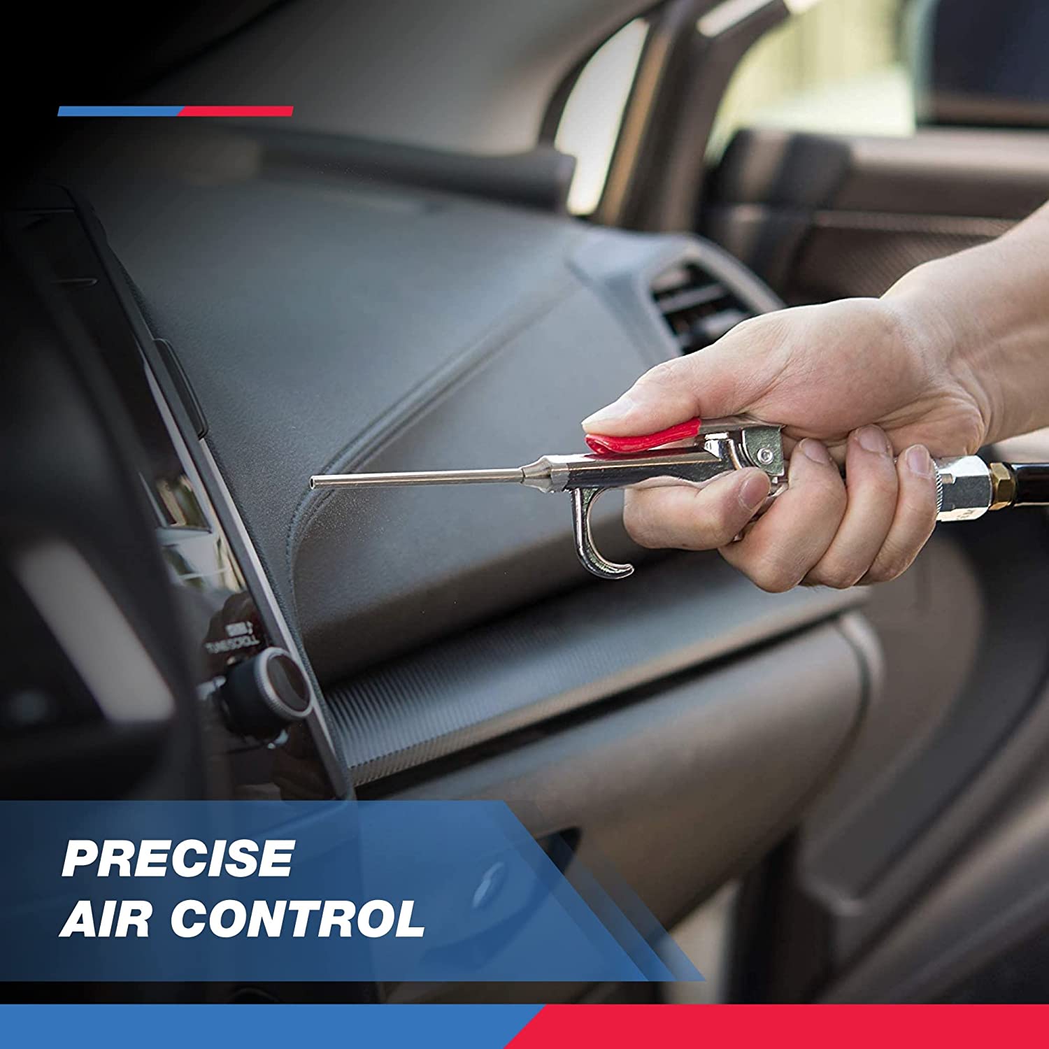 One compact blow gun, five tips for every cleaning task. Soft rubber tip for delicate surfaces, metal tip for directed blasts, inflating needle for balls and inflatables, and 3" and 4" tubes for tight spaces. Heavy-gauge chrome-plated steel body with oversized PVC-coated thumb trigger.