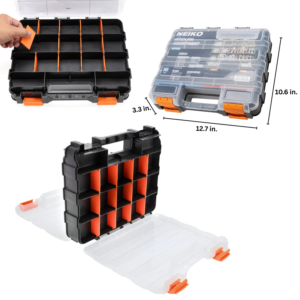 • COMPLETE SET: Includes a tractor hitch pin assortment to meet all your fastening needs in one convenient package; 152pc Hairpin, 25pc O-ring Trailer pin, 10pc Semicircle Trailer pin, 5pc Square Trailer pin, 10pc Double line Trailer pin all in a portable case.