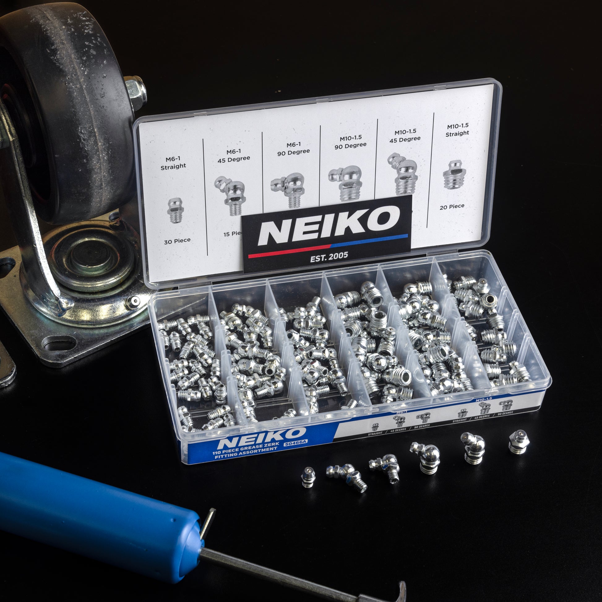 For added convenience, the kit comes with a durable plastic storage case that organizes each metric grease zerk in separate compartments, along with an easy-to-read organization chart to keep everything neat and accessible. The set includes 30 straight (M6-1) fittings, 15 45° degree (M6-1) fittings, 15 90° degree (M6-1) fittings, 20 straight (M10-1.5) fittings, 15 45° degree (M10-1.5) fittings, and 15 90° degree (M10-1.5) fittings, ensuring you have the right fit for any task.