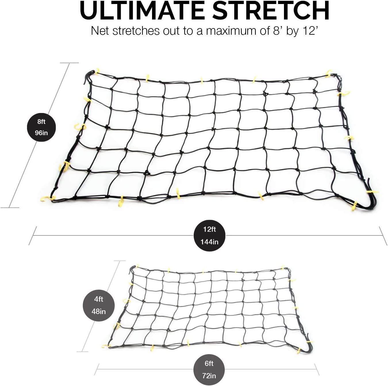 - EXPANDABLE MESH CARGO NET: 4 ft x 6 ft spider bungee dimensions expands up to 8 ft x 12 ft to provide secure coverage for roof top cargo carriers, truck nets, luggage racks of trucks, trailers, jeeps, SUV’s, RV’s or any oversized loads.