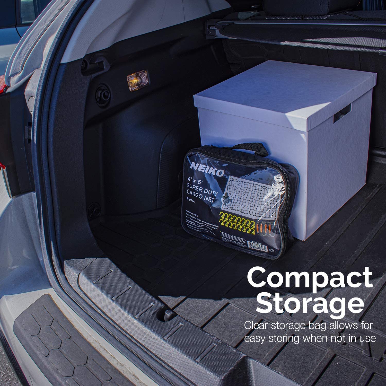 The NEIKO Universal Heavy-Duty Cargo Net is the perfect solution for securing all the storage on your vehicle. It comes with a heavy duty 5mm thick black Bungee Cords, which are constructed of super elastic natural rubber bands that give it excellent durability and UV Resistance for long term use. Although the cargo net’s standard dimensions sit at 4ft x 6ft, its stretch capability lets it expand up to 8ft x 12ft for maximum coverage!The specially designed 6 inch x 5 inch Grid Pattern can stretch and hold bulky and oversized objects, while the smaller grid pattern prevents small items from falling out. This makes it ideal for securing boxes, bags, or personal belongings in a pickup truck’s bed, hitch cargo carrier, or even the roof rack cargo basket.Along with the premium cargo net, it comes packaged with 16 pieces of detachable nylon hooks and 4 piece adjustable metal “D” clip carabiners for use in a wide variety of ways.This cargo net is not vehicle specific and can accommodate most cars or trucks with hooks.