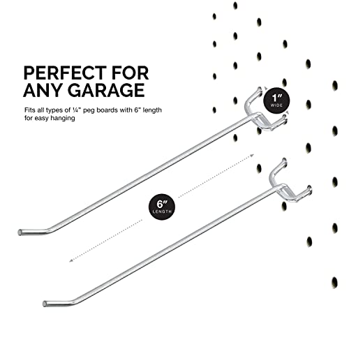 Six-inch hooks handle the longer and heavier tools that shorter hooks can't support. Hardened steel with nickel plating for strength and corrosion resistance. Standard J-style design fits all 1/4" pegboards with 1" spacing.