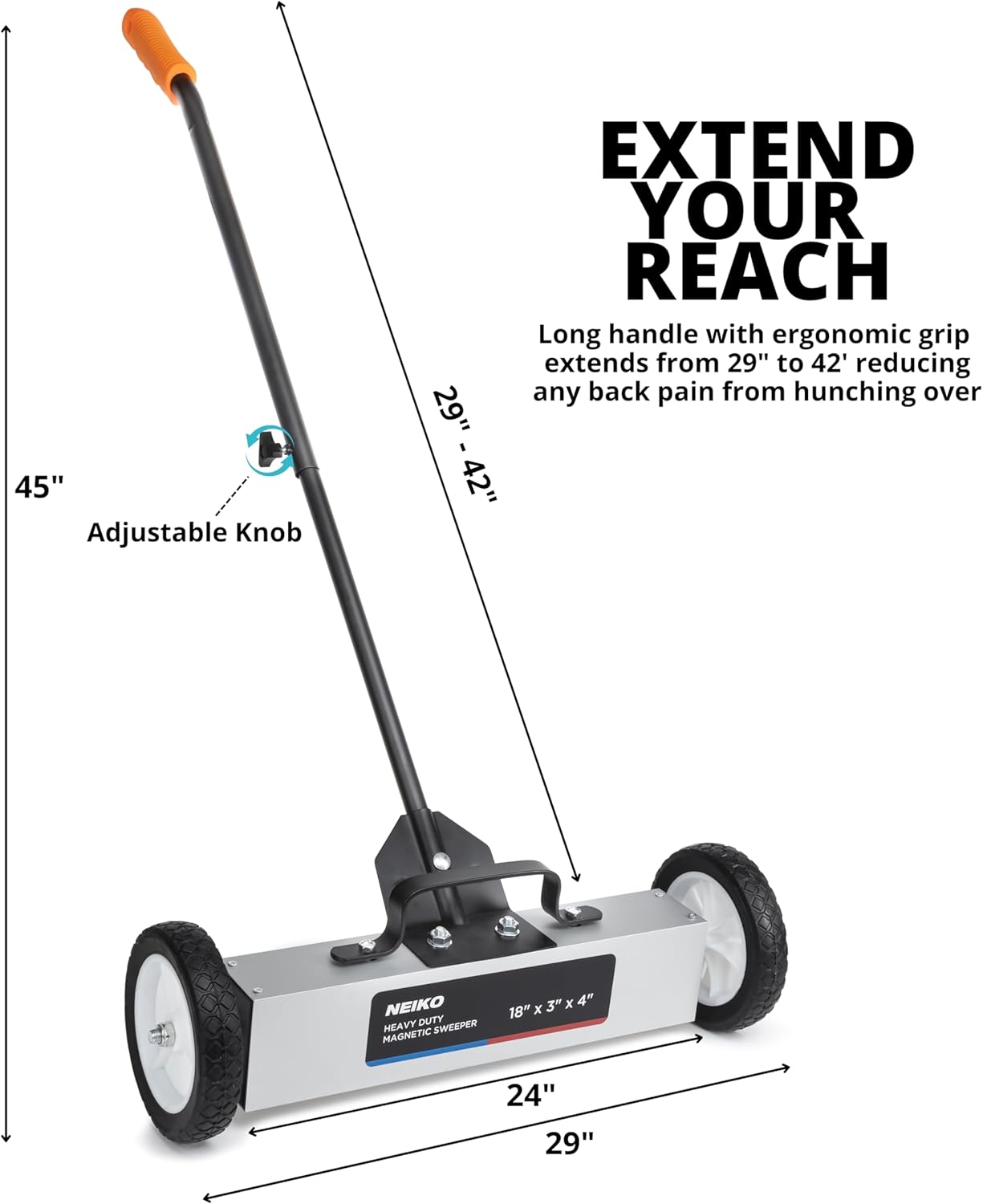 - LONG REACH DESIGN: The telescopic handle has an adjustable height from 31” to 45” that helps avoid back bending and straining while cleaning up the work area. This magnetic pick up clean up tool will make fast work of metal pick up in the shop or garage.