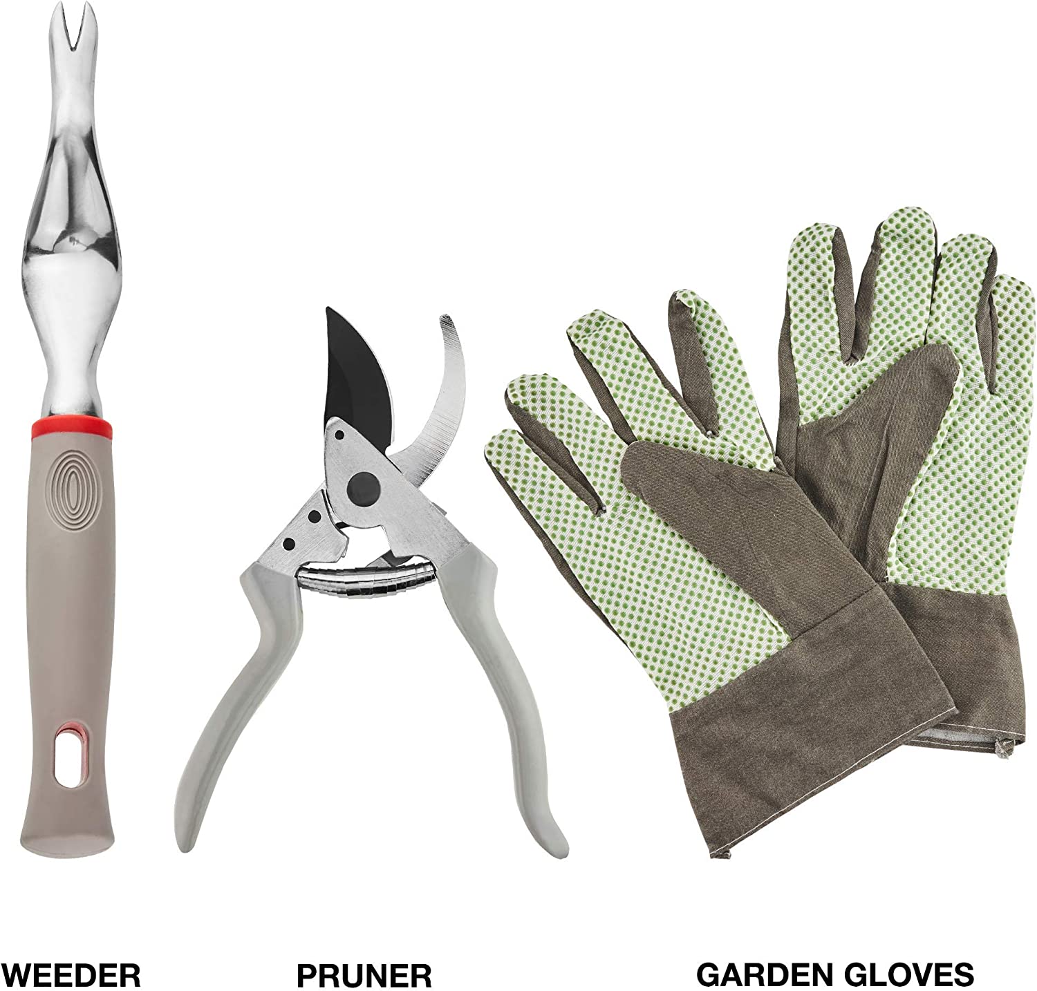 - GARDENING TOOL BAG INCLUDE: Trowel, transplanter, cultivator, rake, weeder, and pruner. Gloves and gardening tool set bag are bonus accessories.